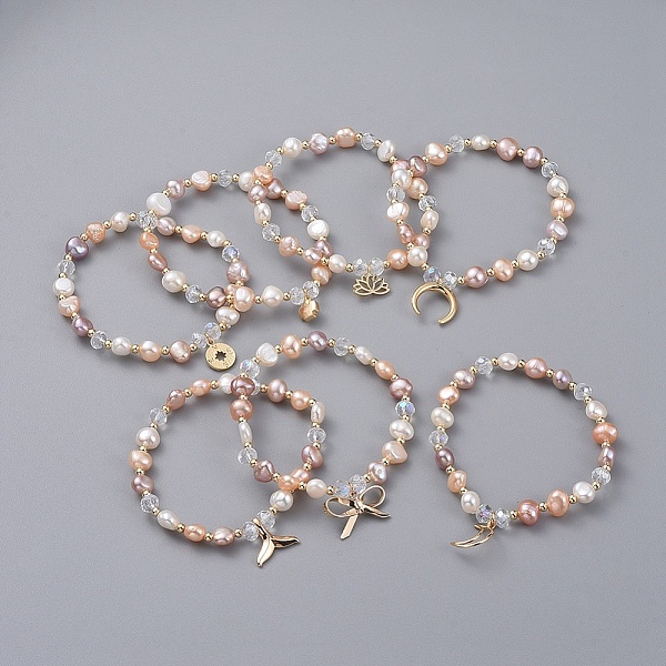 PandaHall Charm Bracelets, with Natural Cultured Freshwater Pearl Beads, Glass Beads, Brass Round Spacer Beads and Brass Pendants, Crescent... Price: $23.17 | PandaHall