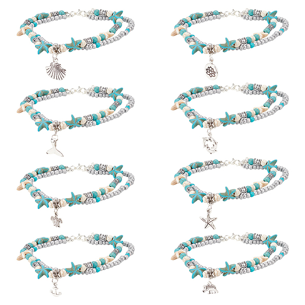 PandaHall ANATTASOUL 8Pcs 8 Style Synthetic Turquoise Starfish & Seed & Resin Beaded Double Layer Multi-strand Anklets Set, Tortoise & Shell... Price: $14.9 | PandaHall