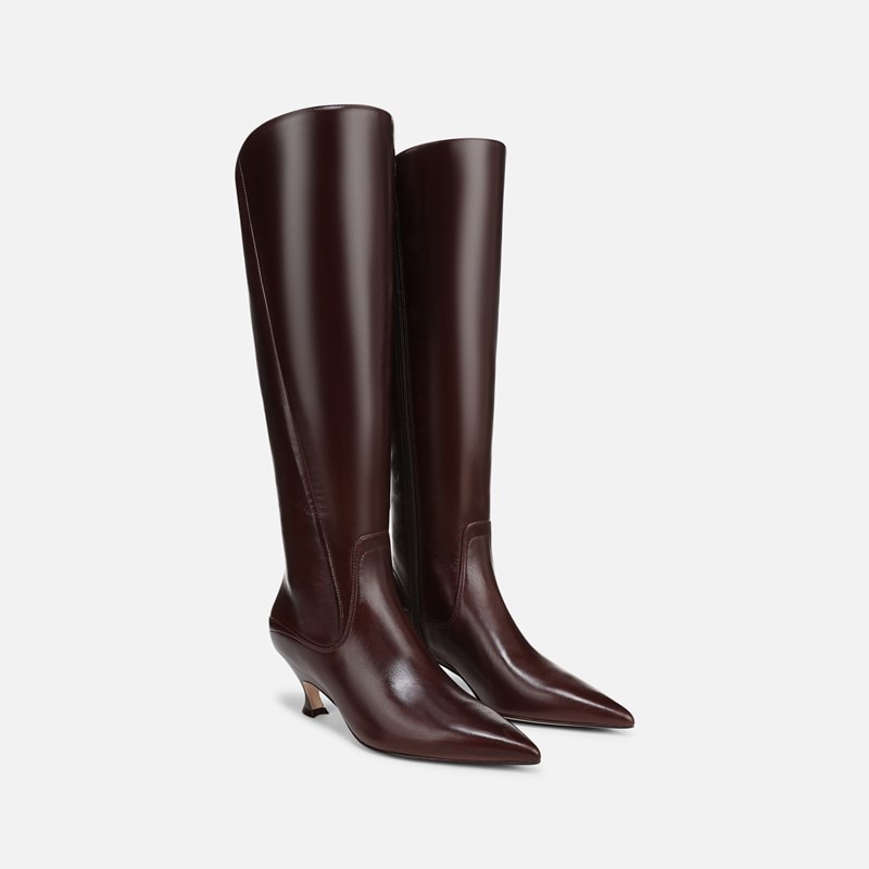 27 EDIT Pepper Knee High Boots, Caramel Brown Leather, 6.0M 3-Inch Heels, Pointed Toe, Zip Closure, Rubber Outsole Price: $295 Sale Price: $88.99