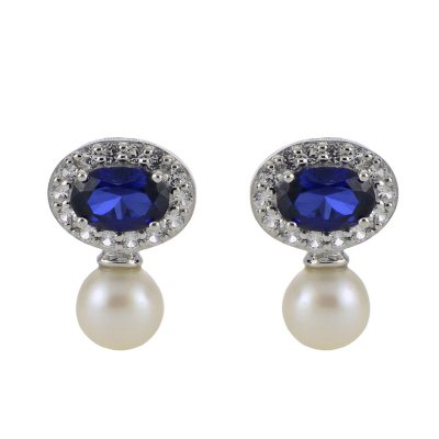 5.5-6mm White Cultured Freshwater Pearl and Lab Created White Sapphire Earrings in Sterling Silver- Lab Created Blue