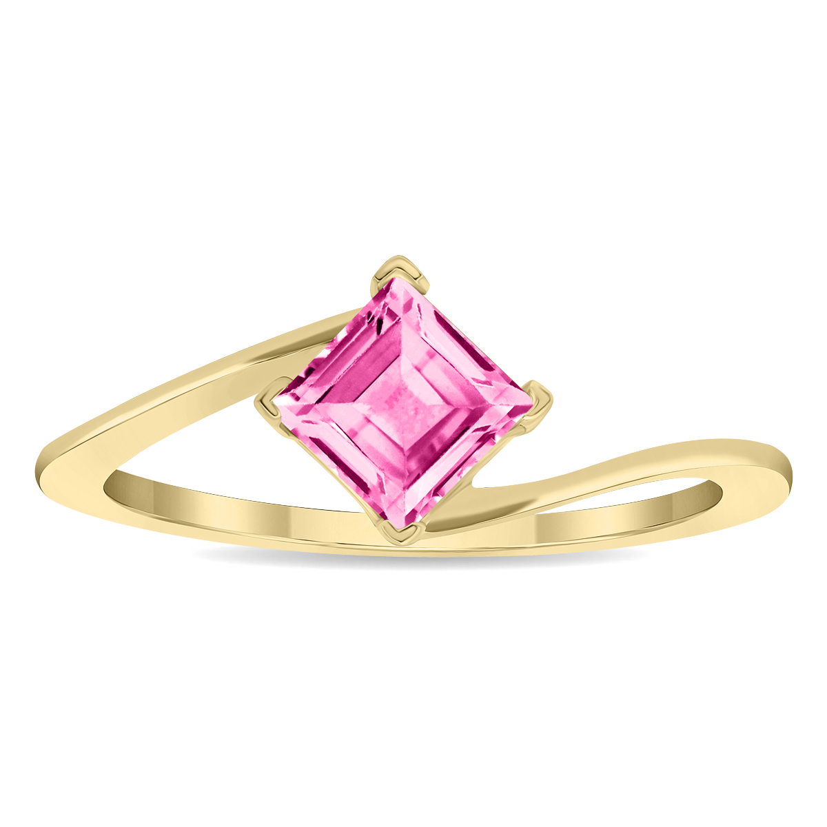 Women's Solitaire Square Shaped Pink Topaz Wave Ring in 10K Yellow Gold