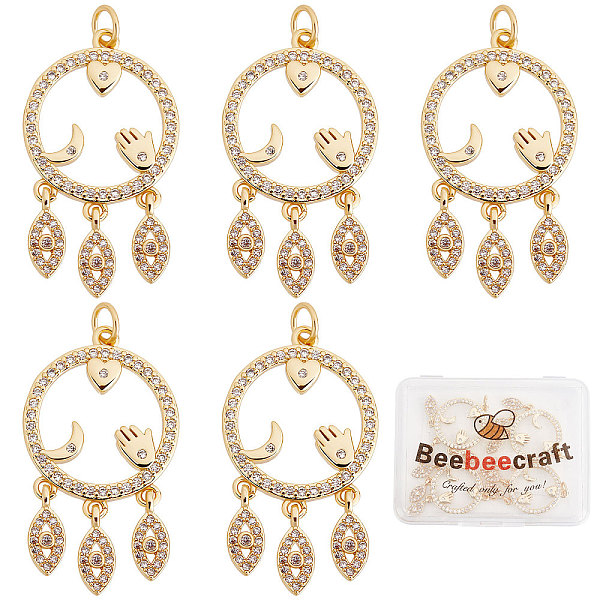 PandaHall Beebeecraft 5Pcs/Box Dreamcatcher Charms 18K Gold Plated Brass Cubic Zirconia Pendant with Heart Moon Palm Eye for Keyring...