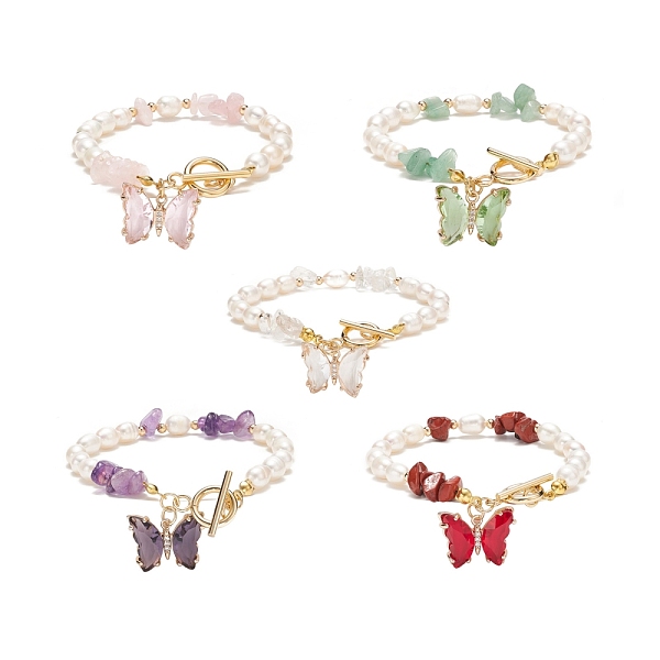 PandaHall Glass Butterfly Charm Bracelet with Clear Cubic Zirconia, Natural Gemstone Chips & Pearl Beaded Bracelet for Women, 7-5/8 inch... Price: $49.63 | PandaHall