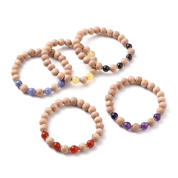 PandaHall Round Wood Beaded Stretch Bracelets, with Natural Gemstone Beads, 61mm Mixed Stone Price: $15.32 | PandaHall