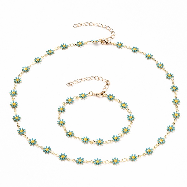 PandaHall Daisy Link Chain Necklaces & Bracelets Jewelry Sets, with Brass Enamel Links, Curb Extension Chain & Lobster Claw Clasps, Golden... Price: $0 | PandaHall