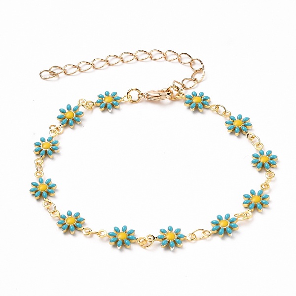PandaHall Golden Brass Flower Enamel Links Bracelets, with Brass Curb Chains & Lobster Claw Clasps, Dark Turquoise, 7-1/4 inch(18.5cm) Brass Price: $0 | PandaHall