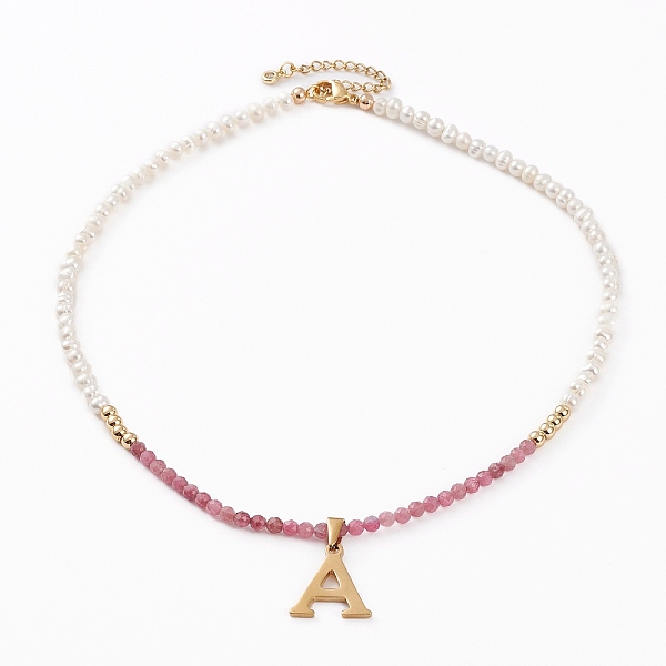 PandaHall 304 Stainless Steel Initial Pendants Necklaces, with Brass Beads, Natural Pearl Beads & Tourmaline Beads, Round, Golden, Letter. A... Price: $29.67 | PandaHall