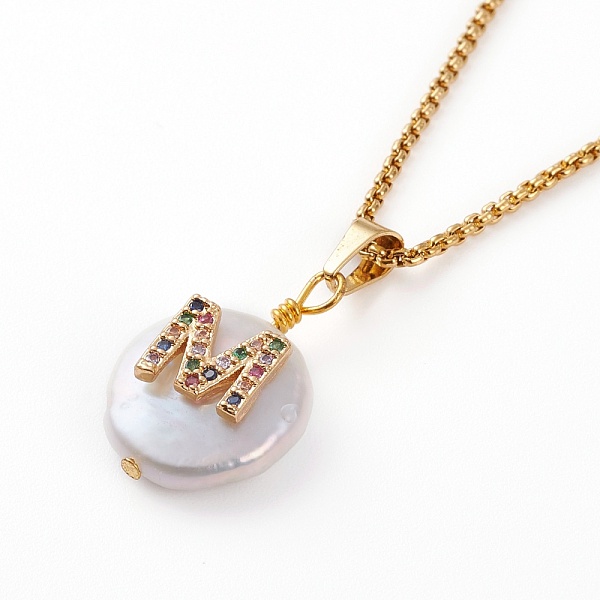 PandaHall Brass Initial Pendant Necklaces, with Shell, Cubic Zirconia and 304 Stainless Steel Cable Chains, Flat Round with Letter, Letter. M... Price: $11.42 | PandaHall