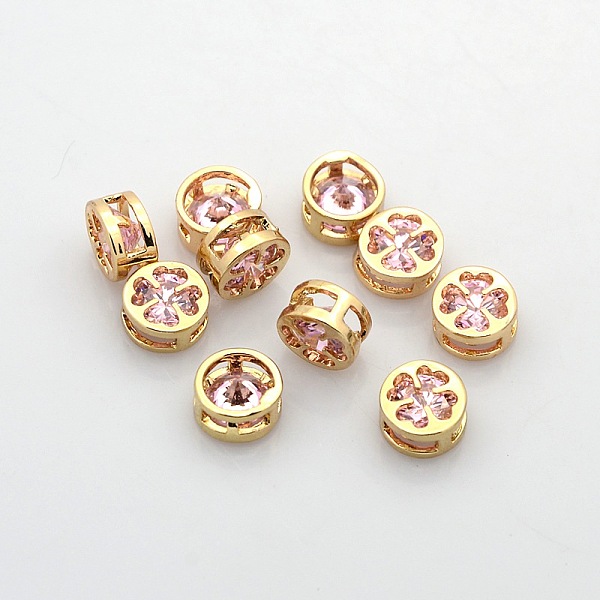PandaHall Real 18K Gold Plated Brass Rhinestone Beads, Flat Round with Clover Pattern, Light Rose, 8x4mm, Hole: 2x6mm Brass+Rhinestone Flat... Price: $0 | PandaHall