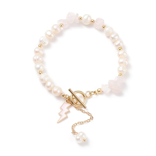 PandaHall Natural Rose Quartz Chips & Pearl Beaded Bracelet with Enamel Lighting Bolt Charms, Gemstone Jewelry for Women, Golden, 7-5/8 inch... Price: $28.35 | PandaHall