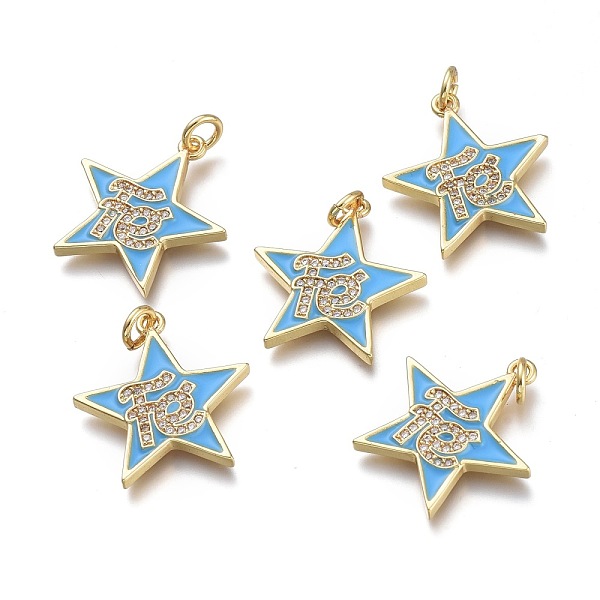 PandaHall Brass Micro Pave Clear Cubic Zirconia Pendants, with Enamel and Jump Rings, Star with Word, Real 18K Gold Plated, Deep Sky Blue... Price: $0 | PandaHall