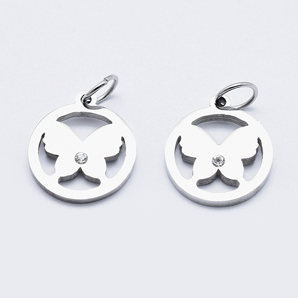 PandaHall Eco-Friendly 316 Surgical Stainless Steel Micro Pave Cubic Zirconia Charms, Long-Lasting Plated, Flat Round with Butterfly... Price: $6.2 | PandaHall
