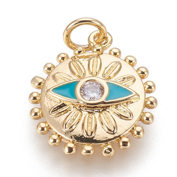 PandaHall Brass Pendants, with Enamel and Cubic Zirconia, Flat Round with Eye, Clear, Golden, 17x15x3mm, Hole: 3.5mm Brass+Cubic Zirconia... Price: $4.73 | PandaHall