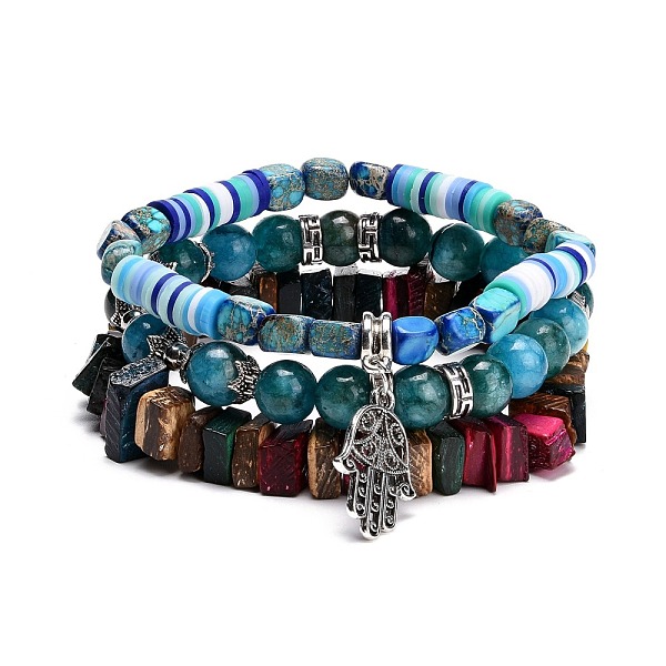 PandaHall Natural Stone & Wood Beads Stretch Bracelets Set, Hamsa Hand /Hand of Miriam Charm Bracelets, Polymer Clay Heishi Surfer Bracelets... Price: $21 | PandaHall