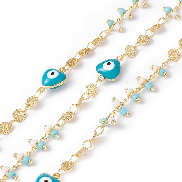 PandaHall Handmade Eco-friendly Brass Flat Round & Heart Link Chain, with Enamel Evil Eye & Glass Seed Beaded, Real 18K Gold Plated, Lead... Price: $48.95 | PandaHall