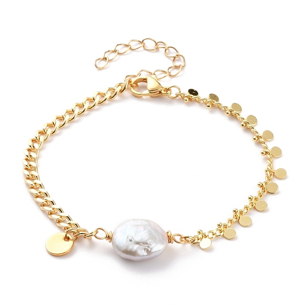 PandaHall Natural Baroque Pearl Keshi Pearl Link Bracelets, with Brass Curb Chains, 304 Stainless Steel Lobster Claw Clasps and Flat Round... Price: $13.69 | PandaHall