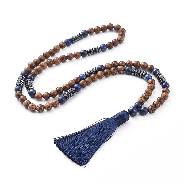 PandaHall Polyester Tassel Pendant Necklaces, with Natural Lapis Lazuli Beads, Wood Beads and Non-magnetic Synthetic Hematite Beads... Price: $22.76 | PandaHall