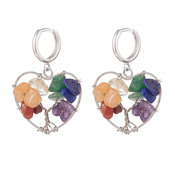 PandaHall Natural Mixed Gemstone Chips Heart with Tree of Life Dangle Hoop Earrings, Brass Wire Wrap Jewelry for Women, Platinum, 40mm, Pin... Price: $0 | PandaHall