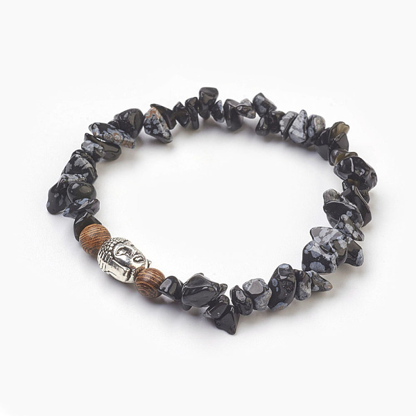 PandaHall Natural Snowflake Obsidian and Wood Beads Stretch Bracelets, with Alloy Findings, Buddha Head and Chip, 1-7/8 inch(4.8cm)... Price: $13.72 | PandaHall