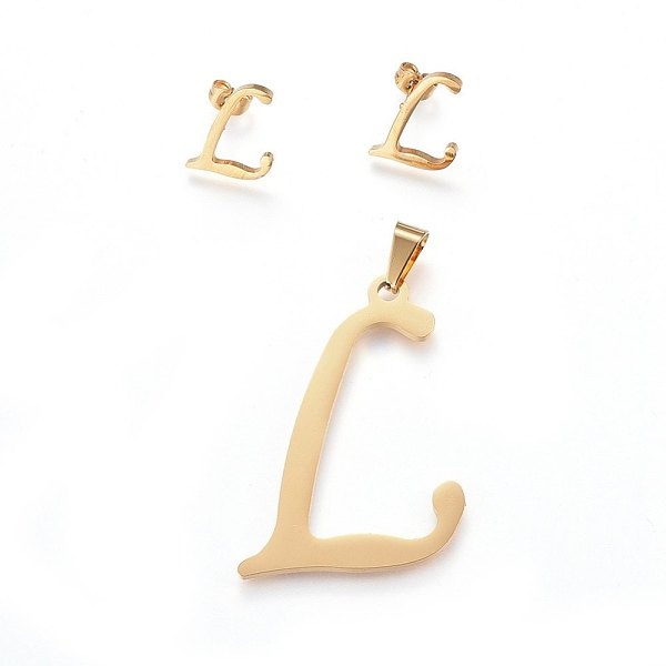 PandaHall 304 Stainless Steel Pendants and Stud Earrings Jewelry Sets, Alphabet, Letter. L, 46x33x1.7mm, Hole: 9x4.5mm, 16x13x1.5mm, Pin... Price: $9.79 | PandaHall