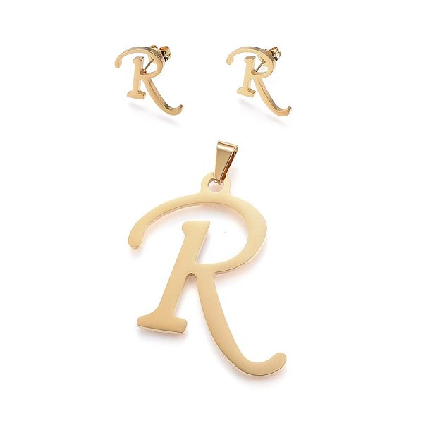 PandaHall 304 Stainless Steel Pendants and Stud Earrings Jewelry Sets, Alphabet, Letter. R, 46x45x1.7mm, Hole: 9x4.5mm, 17x18x1.5mm, Pin... Price: $9.79 | PandaHall