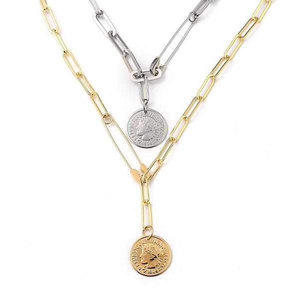 PandaHall Lariat Necklaces, with 201 Stainless Steel Safety Pins, Brass Paperclip Chains and 304 Stainless Steel Coin Pendants, Flat Round... Price: $13.46 | PandaHall