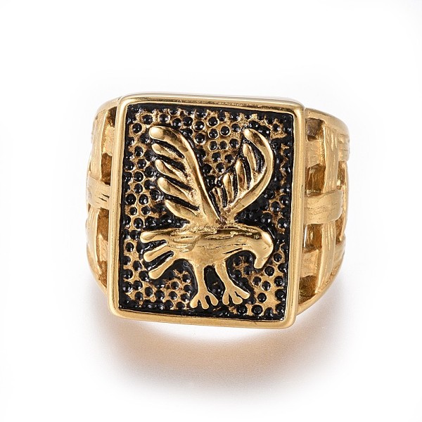 PandaHall 304 Stainless Steel Signet Rings for Men, Wide Band Finger Rings, Eagle, Rectangle with Bird, Antique Golden, Size: 7~12, 17~22mm... Price: $15.67 | PandaHall