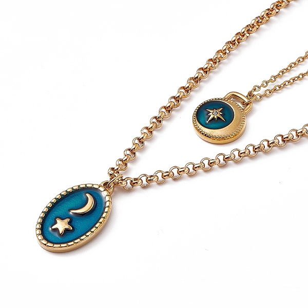 PandaHall Green Enamel Moon Star & Padlock Pendant Double Layer Necklace, Ion Plating(IP) 304 Stainless Steel Rolo & Cable Chains Necklace... Price: $8.81 | PandaHall