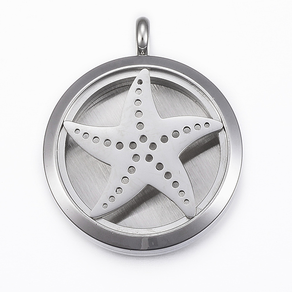 PandaHall 316 Surgical Stainless Steel Diffuser Locket Pendants, with Perfume Pad and Magnetic Clasps, Flat Round with Starfish/Sea Stars... Price: $0 | PandaHall