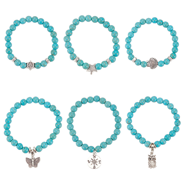 PandaHall ANATTASOUL 6Pcs 6 Style Synthetic Turquoise Round Beaded Stretch Bracelets Set, Helm & Butterfly & Owl Alloy Charms Stackable... Price: $10.86 | PandaHall