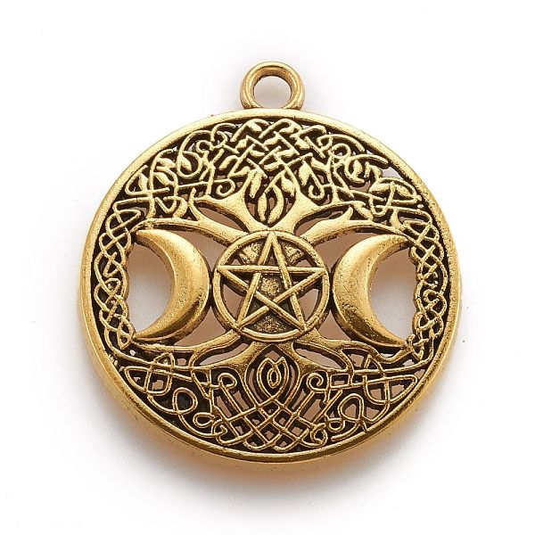 PandaHall Tibetan Style Hollow Alloy Pendants, Lead Free & Cadmium Free, Flat Round withTriple Moon Goddess, Pagan Jewelry, Antique Golden... Price: $10.77 | PandaHall