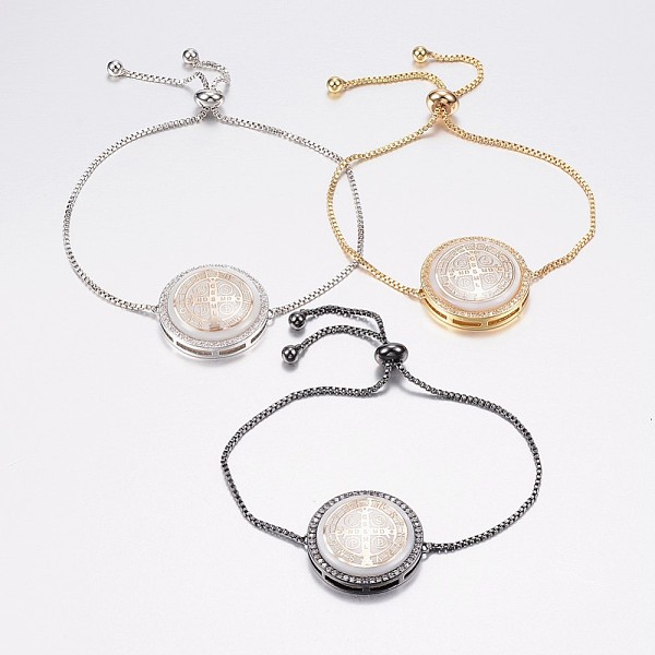PandaHall Adjustable Brass Micro Pave Cubic Zirconia Shell Bolo Bracelets, Slider Bracelets, with Brass Box Chains, Flat Round with Saint... Price: $18.6 | PandaHall