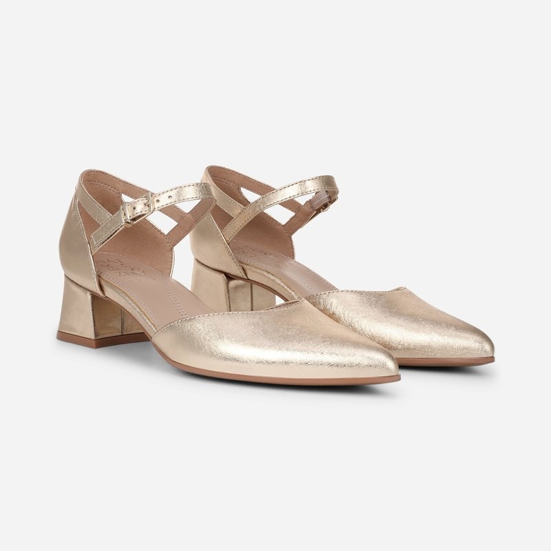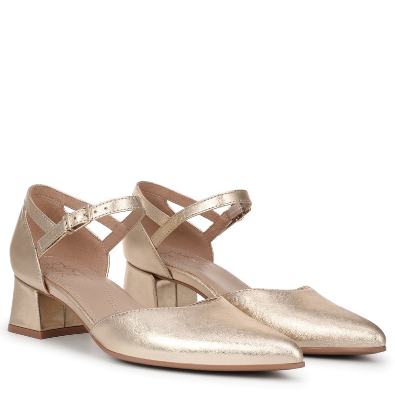 Naturalizer Maddox Strappy Pump Shoes, Champagne Metallic Leather, 7.0M Pointed Toe, Block Heels Price: $148 | Beyond Polish