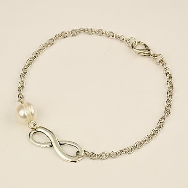 PandaHall Fashion Tibetan Style Infinity Link Bracelets, Iron Chains with Grade A Pearl Beads and Alloy Lobster Claw Clasps, Antique Silver...