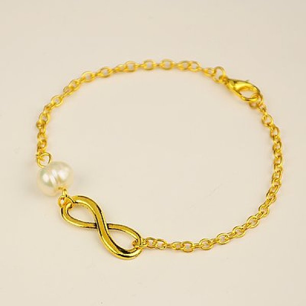 PandaHall Fashion Tibetan Style Infinity Link Bracelets, Iron Chains with Grade A Pearl Beads and Alloy Lobster Claw Clasps, Antique Golden...