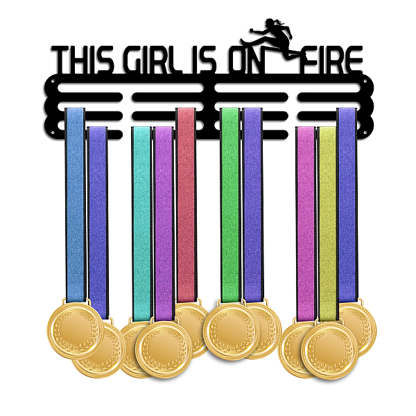 PandaHall Fashion Iron Medal Hanger Holder Display Wall Rack, 3 Lines, with Screws, Word This Girl Is On Fire, Running Pattern, 150x400mm... Price: $12.75 | PandaHall